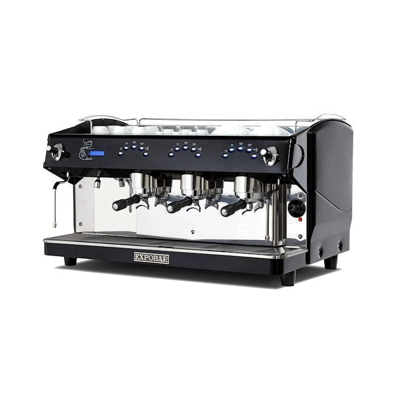 Automatic espresso coffee machine with 3 groups, electronic switchboard to control the coffee dosages volumetrically, with automatic water filling and copper boiler with 17,5 litres capacity with heat exchanger per group and cleaning valve. Two steam tap (stainless steel) and one hot water tap. Display: advertising, automatic dosing of hot water, time management, and memorization of total brewed coffees, daily automatic switch ON/OFF of the coffe machine, control of the boiler temperature through display.