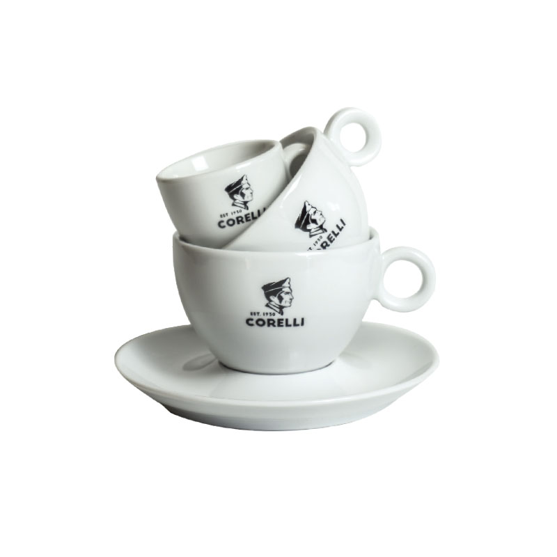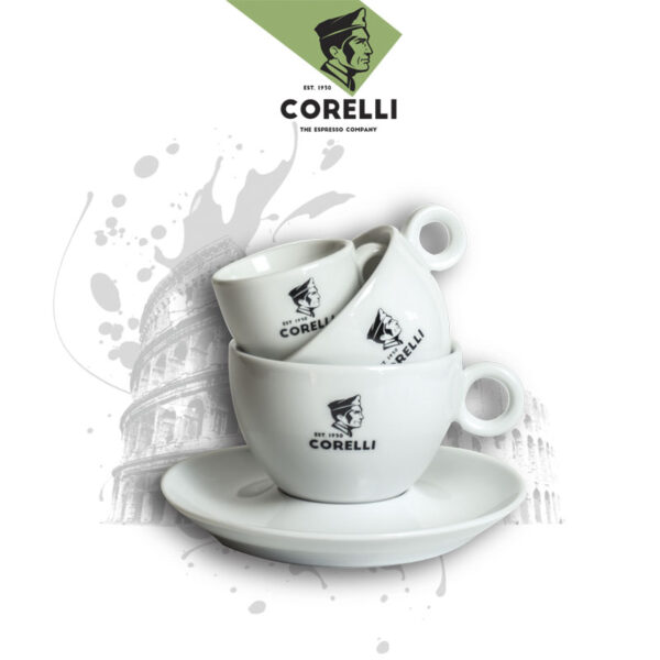Φλιτζάνια γυάλινα espresso, cappuccino, cappuccino grande λευκά με λογότυπο εταιρίας Espresso Corelli και χωρητικότητας: