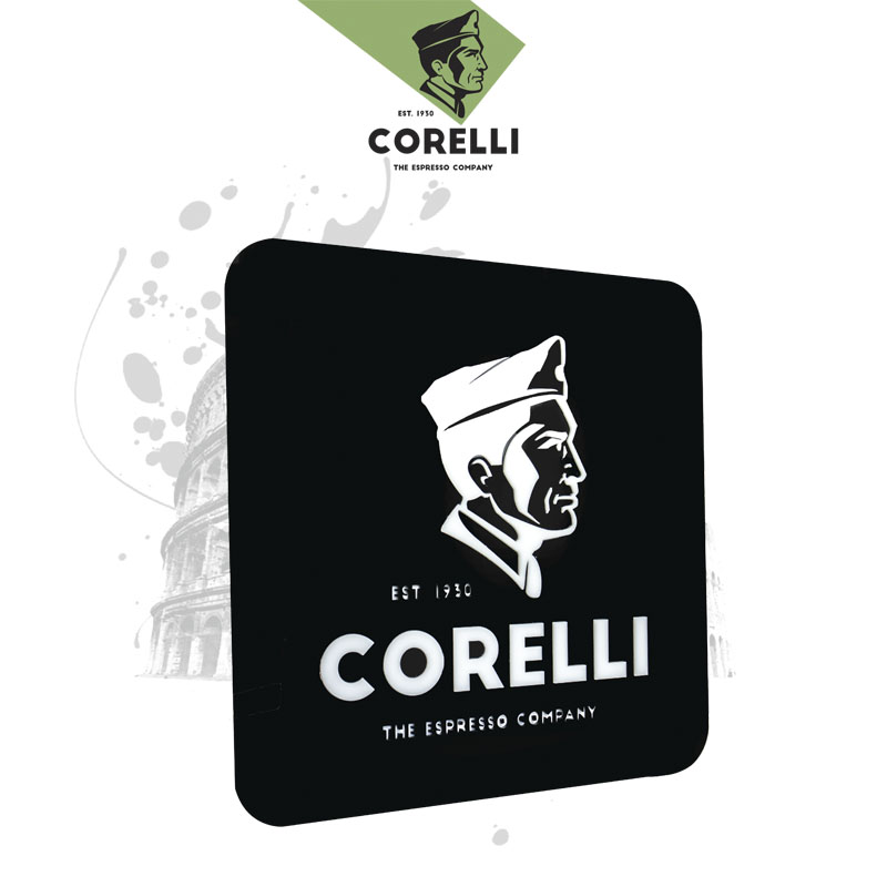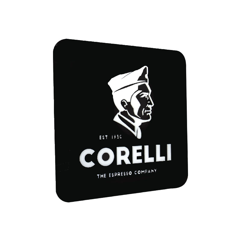 Πινακίδα Espresso Corelli μαύρου χρώματος με λογότυπο εταιρίας, κρυφό φωτισμό led, επιτοίχια, διαστάσεων 40cm x 40cm.