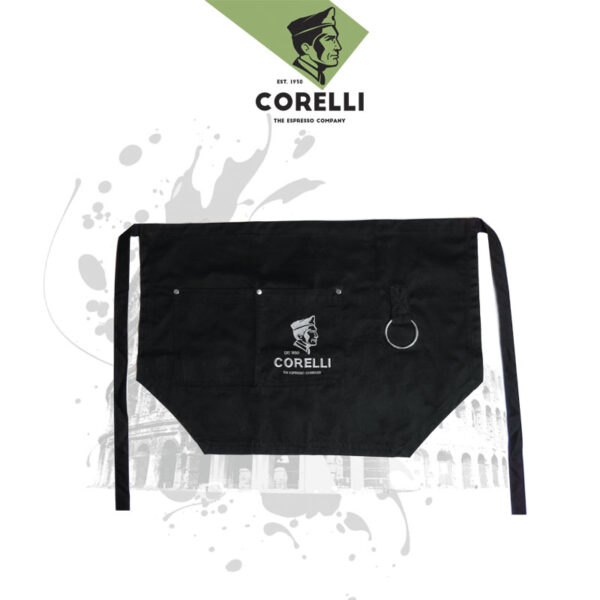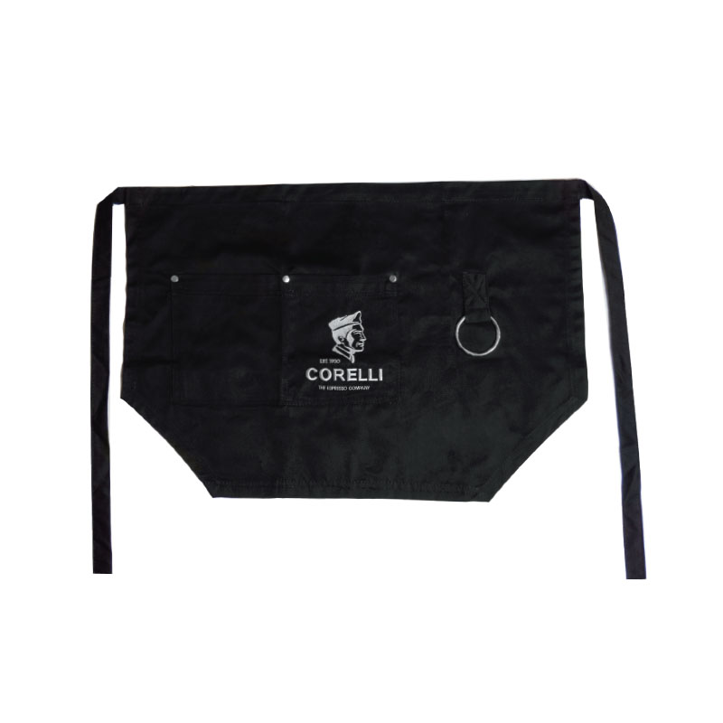 Ποδιά υφασμάτινη Espresso Corelli service μαύρου χρώματος με κεντητό λογότυπο της εταιρίας, μπροστινή τσέπη και ασημί κρίκο πετσέτας.