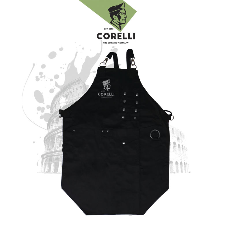 Ποδιά υφασμάτινη Espresso Corelli barista, μαύρου χρώματος με κεντητό λογότυπο εταιρίας, μπροστινή τσέπη, ασημί κρίκο πετσέτας και ασημί λεπτομέρειες.