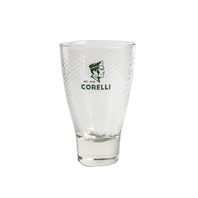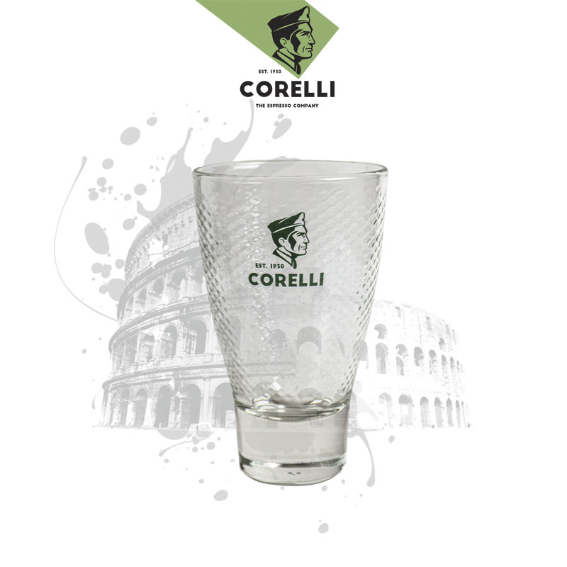 Ποτήρι γυάλινο Freddo Cappuccino διάφανο με λογότυπο εταιρίας Espresso Corelli χωρητικότητας 37cl/370 ml.